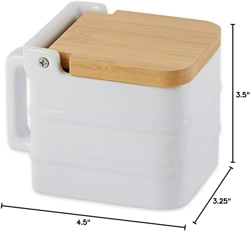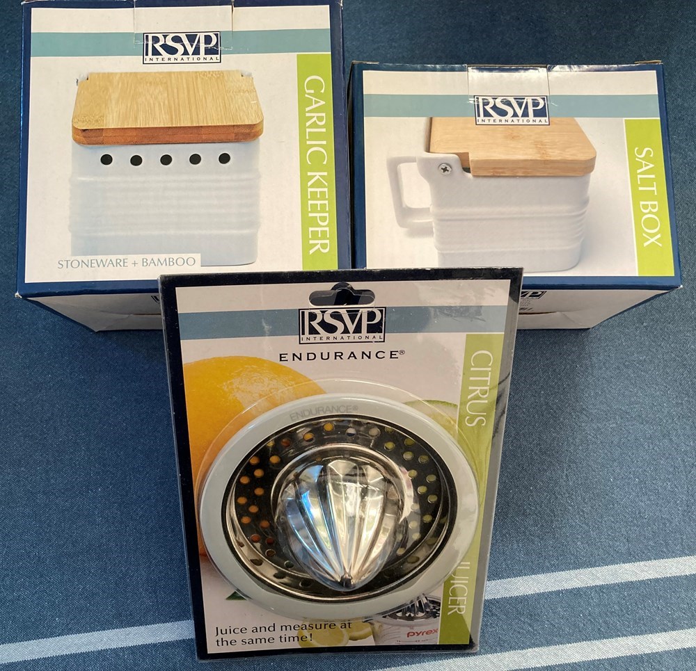 RSVP International 3-Piece Kitchen Set Includes: • White Stoneware Kitchen Collection, Salt Box, 4.5x3.25x3.5" • White Stoneware Kitchen Collection, Stoneware Garlic Keeper, 4.5x4x4.5 • Manual Hand Citrus Juicer Squeezer, Stainless Steel, 4.75" Diameter. Use w/ Pyrex Cups, Bowls, Dishwasher Safe,Silver