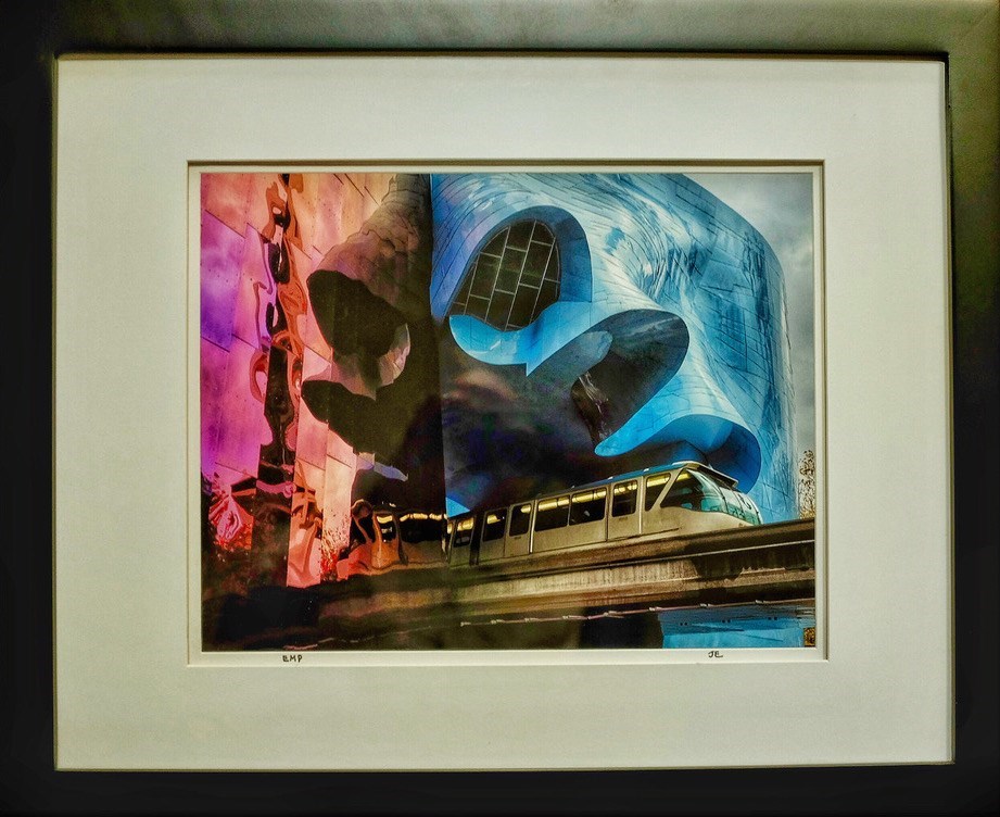 MOPOP & Monorail Photograph by Jean Erreca - 14"×17" Print The architecture of the MOPOP (Museum of Pop Culture) building in Seattle is inspired by the energy, movement and fluidity of the art it exists to celebrate. A symphony of textures, myriad colors and flowing design elements create a one-of-a-kind visual experience. Three-thousand panels, made up of 21 thousand individually cut and shaped stainless steel and painted aluminum shingles, blanket the building's exterior responding to changes in light conditions and appearing to shift when viewed from different angles, reminding audiences that music and culture are forever evolving. MOPOP’s architect, Frank O. Gehry, used Computer Aided Three-Dimensional Interactive Application (CATIA) in the creation of the building—the first architect to do so.