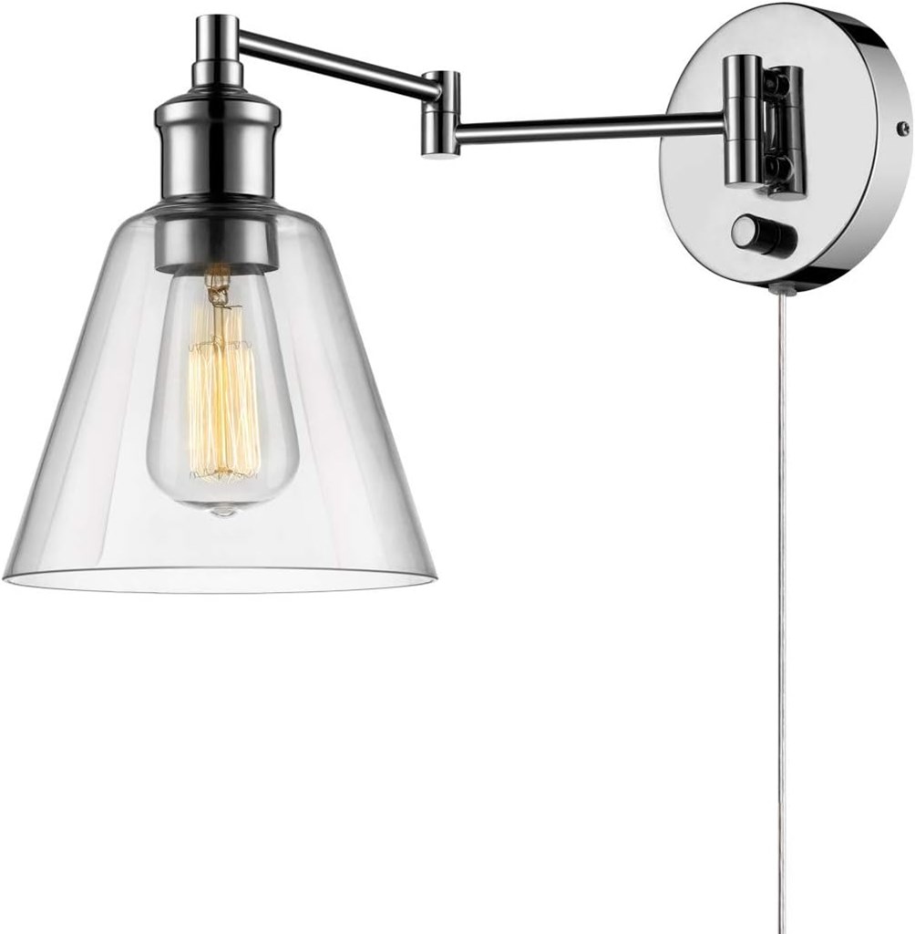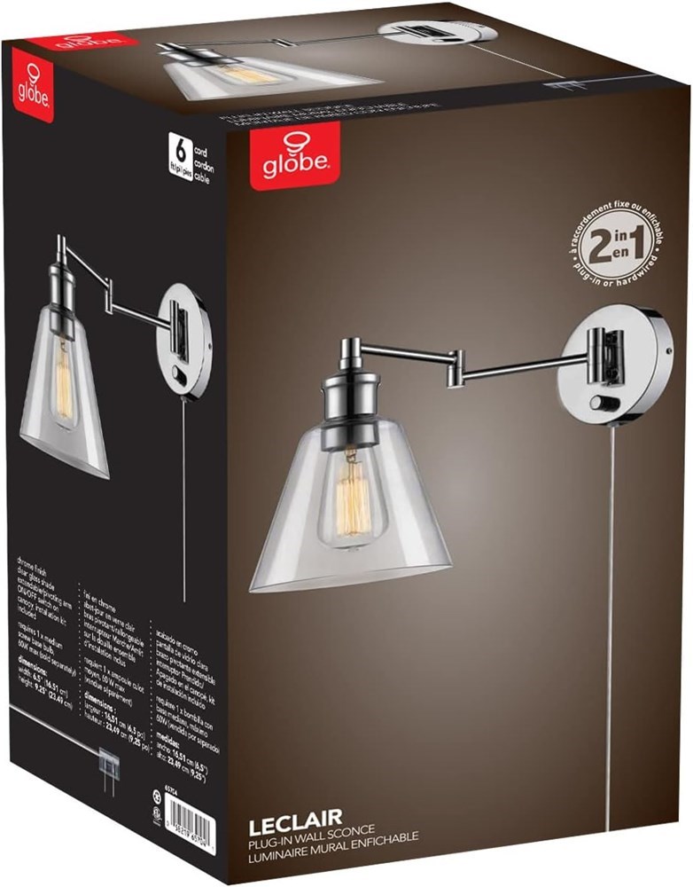 Globe Electric 1-Light Plug-in Wall Sconce - Chrome Finish • PLUG-IN OR HARDWIRE CAPABILITY: the innovative 2-in-1 design allows you to install your pendant as a plug-in so you can place it anywhere in your home or use the hardwire option to create a sleek cordless look • VINTAGE INSPIRED: fashioned after vintage inspired lighting, this downward wall sconce is perfect for bringing a turn-of-the-century industrial look to any area • EXPOSED BULB: the clear glass shade showcases the bulb beautifully. Create a truly unique look by adding a Globe Electric vintage-inspired Edison bulb • EASY INSTALL: includes all mounting hardware for quick and easy installation • BULB REQUIREMENTS: 1x E26/Medium Base 60W Bulb (not included) *Please note there might be an extra charge for shipping. Local deliveries in the greater Seattle area are free.