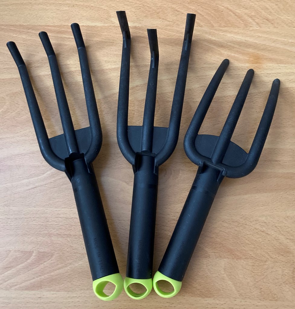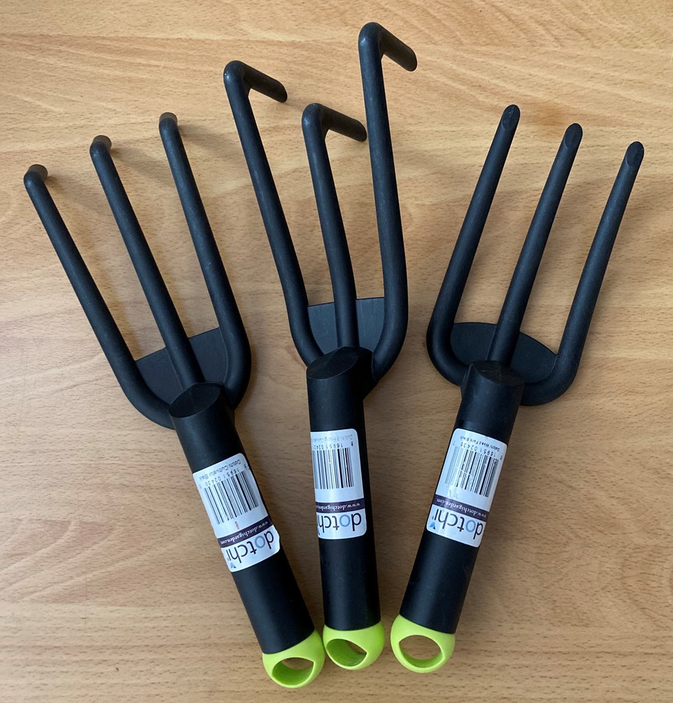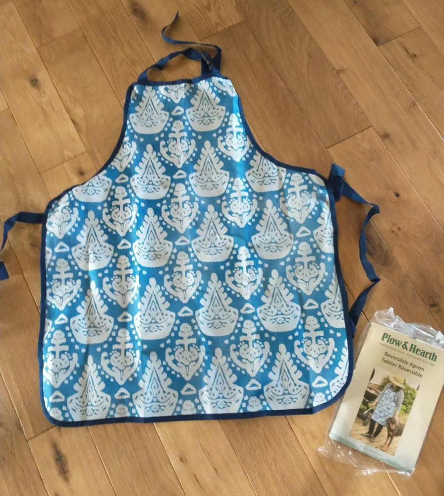 Plow And Hearth Reversible Apron Backyard Oasis Blue 27"x32" Reversible apron features unique pattern on one and coordinating sold color on the other. High bib front, adjustable neck strap and generous side straps make this a perfect one-size fits all apron. Easy care, machine wash. AND Dotchi Garden Tools Set of 3 - The Dotchi tools are ergonomically designed with rounded handles and lighter materials for easy go-to gardening. • Cultivator Tool This cultivator features a three-pronged head with curved tines that can easily penetrate even hard-packed soil. It is lightweight and easy to use, making it a great choice for gardeners of all skill levels. This versatile tool is great for loosening and aerating soil, mixing compost and manure into the soil, removing weeds and other debris, creating planting furrows, and more! • 3-Prong Hand Cultivator A must-have tool for all gardeners! The 3-prong cultivator can be used for mixing soils or compost, aerating the ground, hand-tilling, raking, and cleaning debris in hard-to-reach spots. • 3-Prong Weeding Fork You can rest a little easier thanks to our ergonomically designed, lightweight weeding fork. Perfect for both beginner and experienced gardeners, this sturdy garden fork is ideal for getting under weeds, shallow-rooted plants and loosen soil especially in tight narrow spaces.
