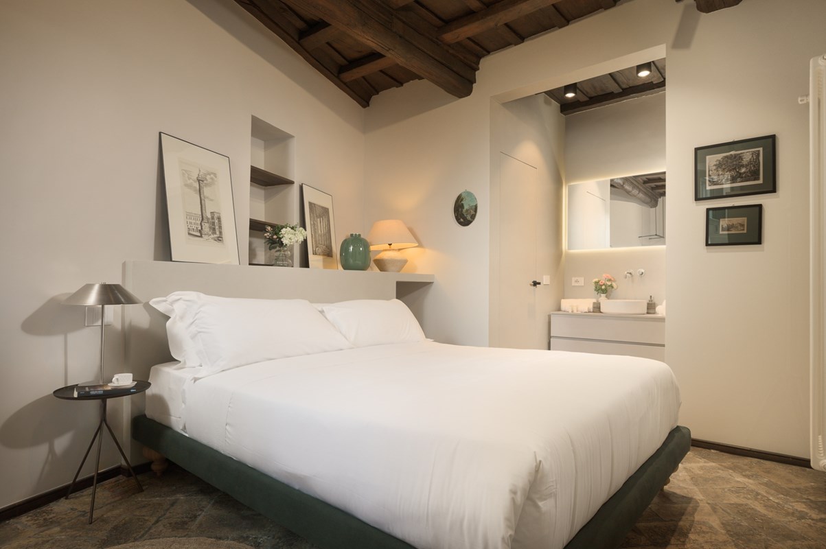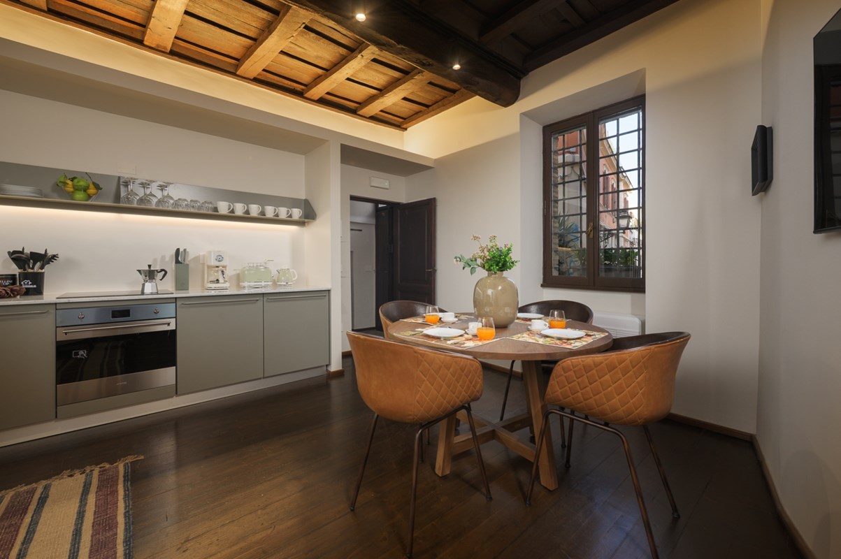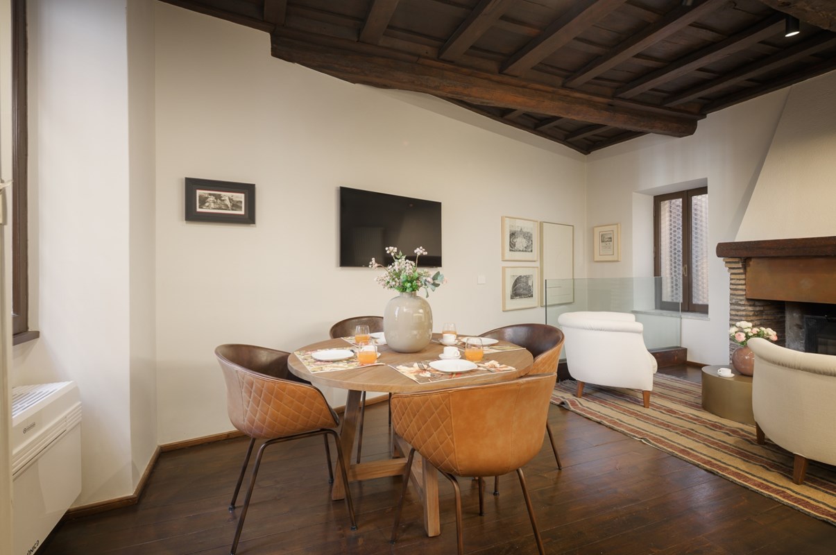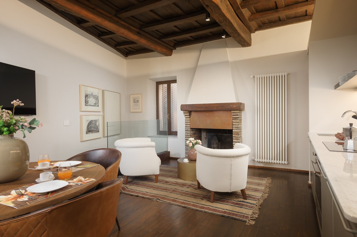 LOCATION Rome, Italy APARTMENT DESCRIPTION Located right in the heart of Rome, this charming, well positioned apartment is spread over three floors, with a total of two double bedrooms and three bathrooms that can comfortably accommodate up to four guests. Upon entering the apartment, on the left side you will find a living area with armchairs, great for kicking back and relaxing after a full day of exploring Rome. There is also a fully equipped kitchen and dining area complete with all amenities you might need for making a delicious meal. On this level there is also a convenient guest bathroom. From here, a staircase leads down to a lower level with a cozy lounge area with a TV awaits—another great spot for relaxing and rejuvenating. From the entrance on the ground floor, stairs lead up to the first floor, where you will find one double bedroom with an en-suite bathroom featuring a shower. Continuing on up to the second floor, you will find a charming attic-style double bedroom with a private bathroom that is located just outside the bedroom. This bathroom also has a shower. The apartment is equipped with all amenities that will ensure that your stay is a comfortable one. All details have been curated with care, and the elegant style and design will make for a memorable stay. The property has air conditioning and heating, so you will be comfortable regardless of the season. The central position of the property means you are just a short walk from many of the city's major sites, such as the Colosseum. This will be the perfect home base for your Roman holiday adventure!