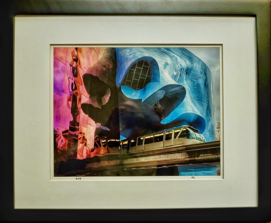 MOPOP & Monorail Photograph by Jean Erreca - 14"×17" Print The architecture of the MOPOP (Museum of Pop Culture) building in Seattle is inspired by the energy, movement and fluidity of the art it exists to celebrate. A symphony of textures, myriad colors and flowing design elements create a one-of-a-kind visual experience. Three-thousand panels, made up of 21 thousand individually cut and shaped stainless steel and painted aluminum shingles, blanket the building's exterior responding to changes in light conditions and appearing to shift when viewed from different angles, reminding audiences that music and culture are forever evolving. MOPOP’s architect, Frank O. Gehry, used Computer Aided Three-Dimensional Interactive Application (CATIA) in the creation of the building—the first architect to do so.